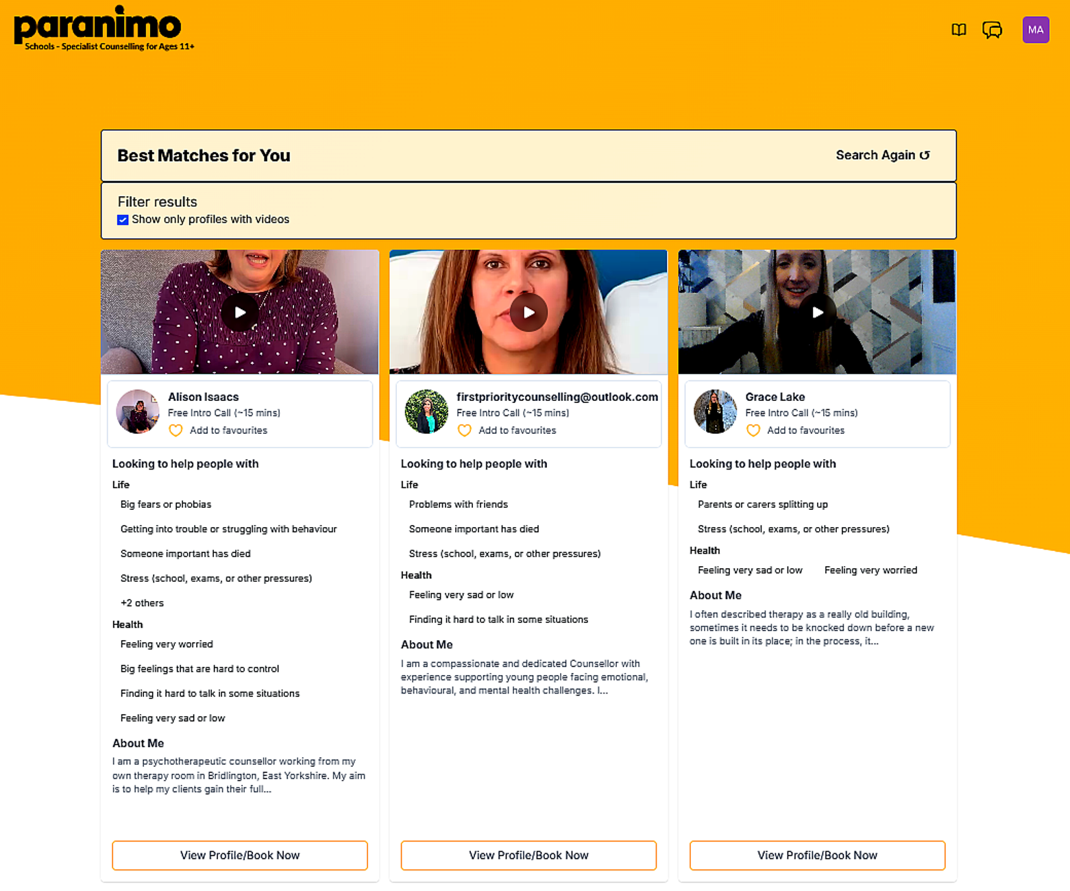 Paranimo Schools is an online counselling matching platform that connects pupils aged 11+ and school staff with the right therapist quickly, safely, and ethically.
